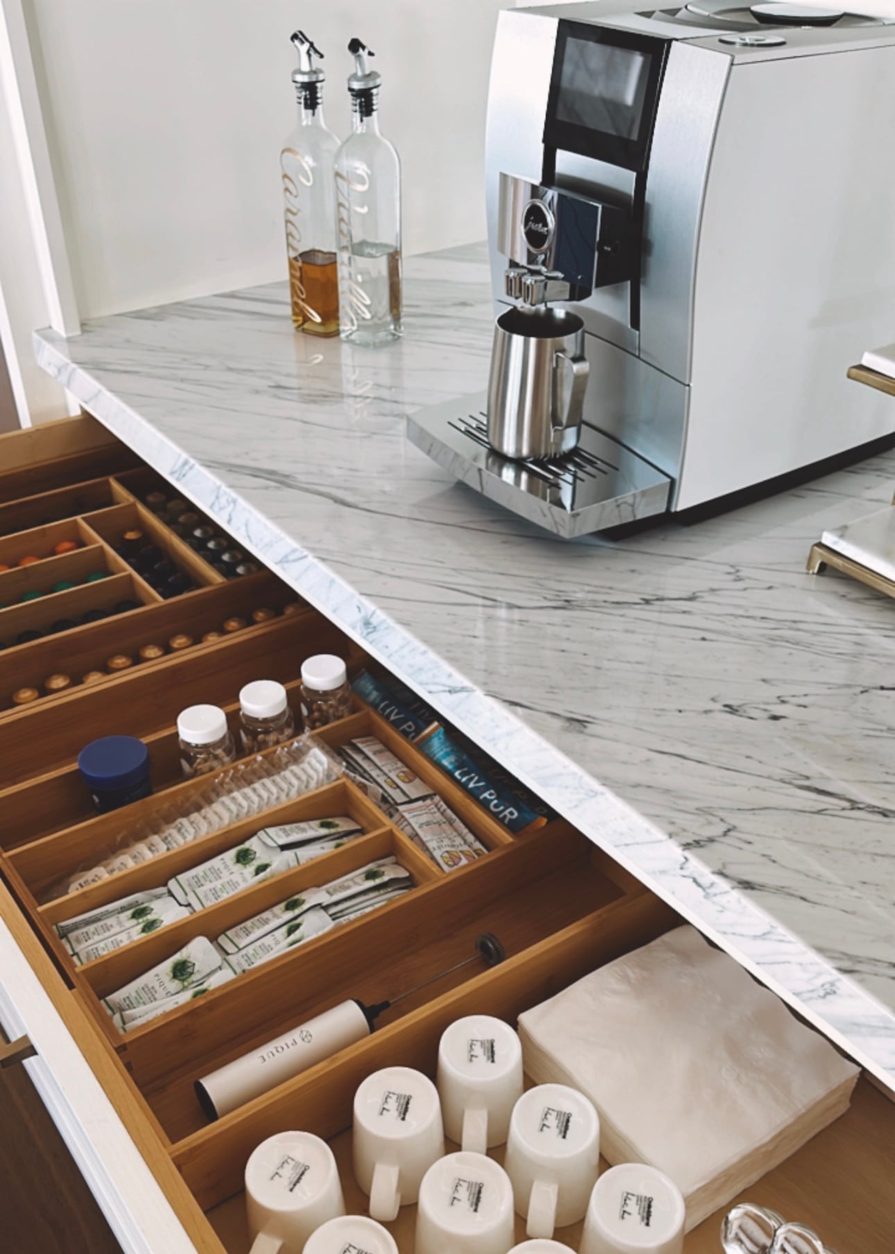 Organizing my kitchen drawer for coffee and drinks…yes please! I love using this bamboo drawer organizer to keep all my coffee pods, matcha and hydration packets organized. It’s so nice seeing what you have and having it easily accessible. I also love that I can fit in my espresso cups and spoons in here too. I like these drawer organizers because they expand giving you the perfect fit. See the video below to see how I used it.