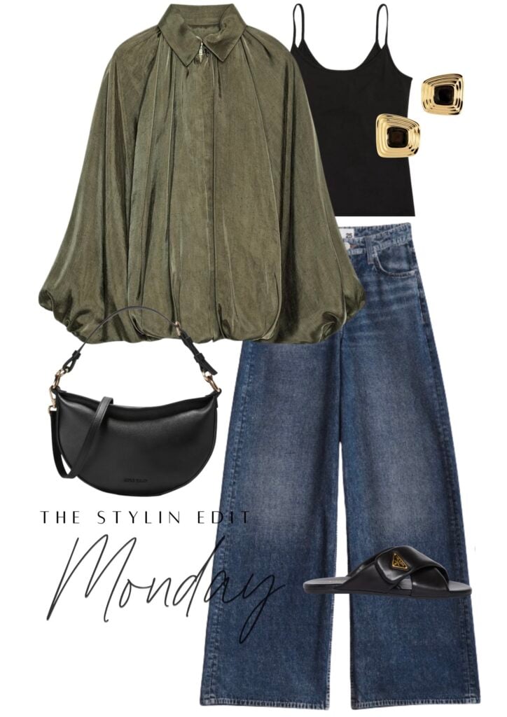Starting the week off with an outfit that feels both relaxed and put-together. Wide-leg denim is having such a moment right now and I love how it instantly updates even the simplest look. Paired with a sleek tank and topped with this beautiful bubble jacket, it’s the kind of outfit that transitions seamlessly from casual mornings to a dinner out. A structured bag and small statement earrings give it that elevated edge, while the easy slides (which by the ay are so comfy) keep it grounded and comfortable. It’s effortless style with just the right mix of polish and ease…perfect for easing into Monday.