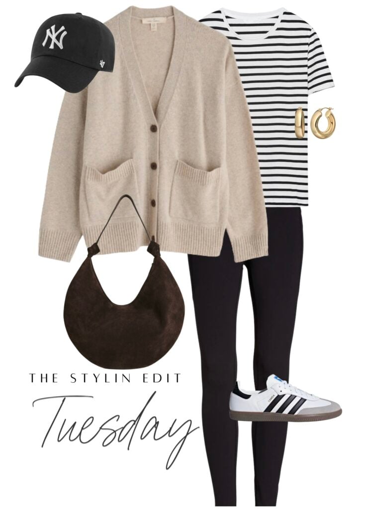 For Tuesday, I’m leaning into athleisure with a polished twist. A striped tee and classic leggings make for the easiest base, and layering on a cozy cardigan instantly takes it up a notch. Sneakers keep things practical for running errands or school drop-off, while gold hoops and a suede bag really help elevate it so you feel put together. I love how a baseball cap balances the look…casual, sporty, but still stylish and the best part is you don’t have to really do your hair. This outfit feels effortless but put-together, perfect for those busy weekdays when comfort is key.