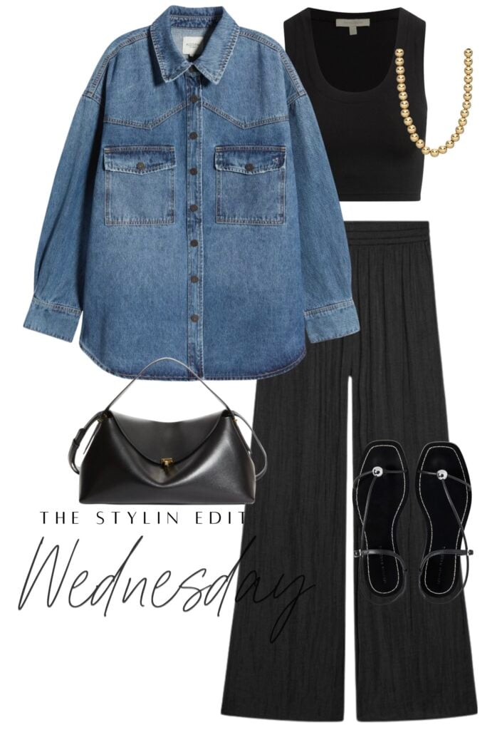 By midweek, I love an outfit that feels laid-back but still has a little structure. Wide-leg pants and a cropped tank are the perfect base…comfortable, easy, and so versatile. Layering on an oversized denim shirt/jacket gives it an effortless but put together style while still keeping things practical for everyday wear. I added in one of my go to sandals and a black bag to tie it all together, and I like finishing it off with a touch of gold jewelry for just the right amount of polish. It’s a look that feels relaxed yet refined, perfect for everything from school pick-up to a casual dinner out.