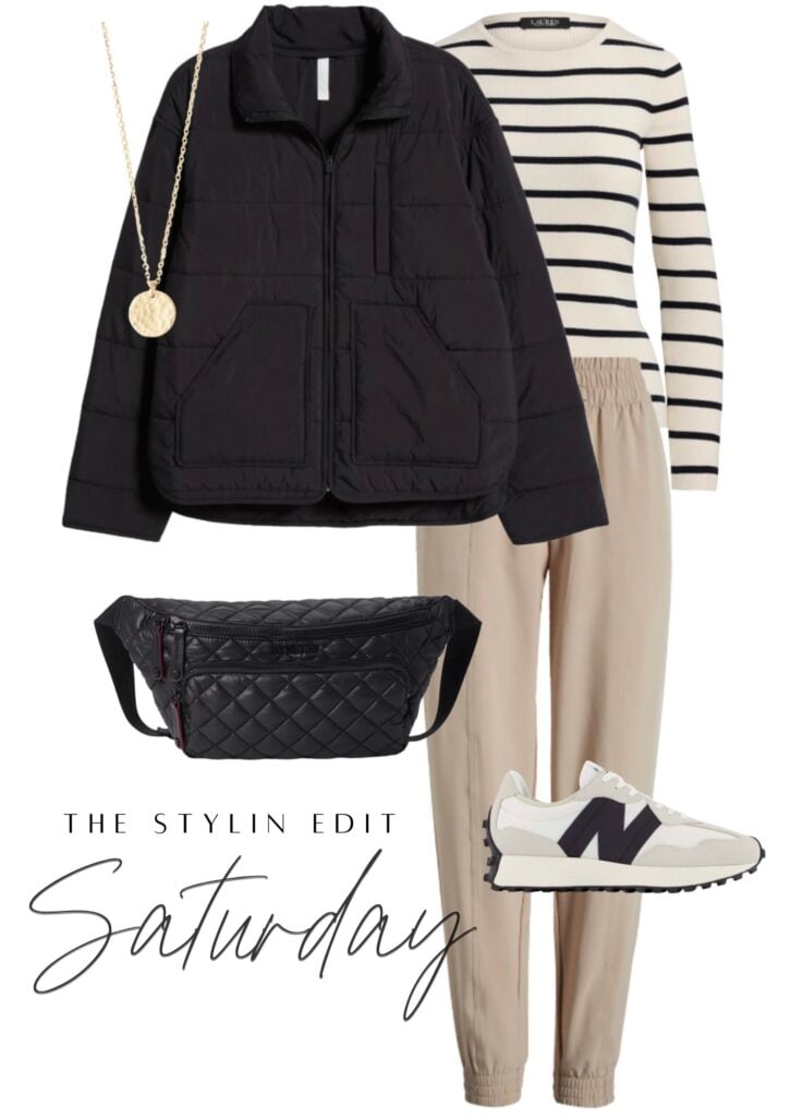 Saturdays are all about easy comfort that still feels put together, and this look nails it. Joggers and sneakers set the tone for a relaxed day, while a striped knit adds a touch of polish. Layering on a lightweight puffer makes it perfect for running errands, heading to your kids soccer game, or grabbing coffee with friends. The quilted belt bag is both functional, stylish, and effortless. I love finishing it off with our hammered coin necklace to add a little pop of gold without overthinking it. It’s casual, cozy, and ideal for wherever the weekend takes you while the weather is cooling down.
