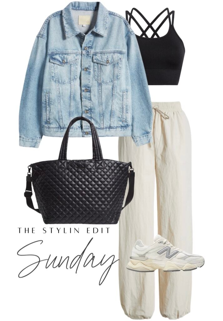 Casual sundays are the best and this look is the definition of easygoing chic. A sleek pair of joggers and sneakers make the perfect base for lounging, errands, or going for a long walk outside. Layering a denim jacket over a cropped tank keeps it relaxed but pulled together. I also love this quilted tote. It’s one of my favorites to travel with because it has so many thoughtful pockets and multiple ways of being carried. It’s roomy enough for all the extras…whether that’s a water bottle, snacks, or even your laptop if you’re catching up on work.